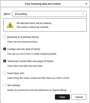 Below are instructions for several popular browsers, as the steps to clear the cache vary depending on the browser used. If certain options listed are not available to you you will need to contact your IT team for assistance.