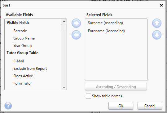 This will open a box where you can select from the fields available in the active table (e.g. Borrowers or Resources) to define the sort order. For example, you can set names within the Borrowers table to be sorted primarily by Surname, then Forename. This would group all surnames in order, and keep each forename within that group in order also.