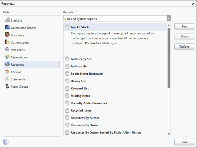 From the 'Table' section on the left-hand side, select the table you wish to run a report on, 'Resources' for resource specific reports, 'Borrowers' for borrower reports, 'Current/Past Loans' for loan reports etc. Different tables have different reports, so have a good look through each table and be sure to select the correct one.